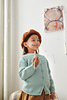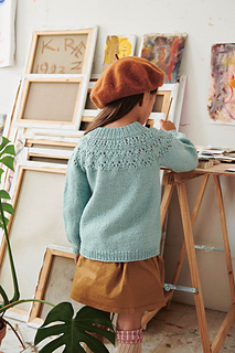 Work cardigan back and forth, from neck down and with inc for round yoke. Work front bands at finishing. With eyelet pattern according to diagram.