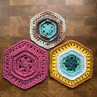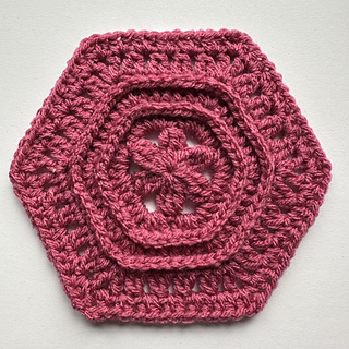 Finished hexagon is same size as solid 6 row hexagon made out of dc’s. Same goes for stitch count: one edge of the finished hexagon is 12 sts (+ 1 ch for each corner .. so finished hexagon on last round has 78 sts).