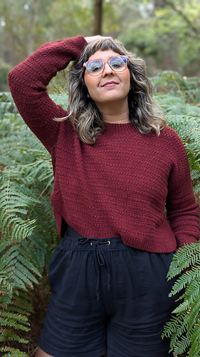 Yarn used in the sample is Retrosaria Rosa Pomar, Mondim (100% fine Portuguese wool, 100g, 385 m / 421 yds) in color C587. Approximately 4 (5, 5, 5, 6) (6, 7, 7, 8) balls of Mondim for a cropped pullover and 5 (5, 6, 6, 7) (7, 8, 8, 9) balls for a full-length pullover.