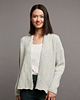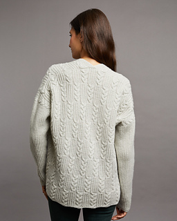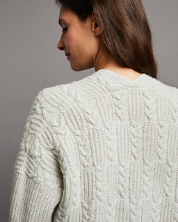 Die verschlusslose Jacke mit geraden Vorderkanten in einem Muster aus Halbpatent- und Zopfblöcken wird von unten nach oben und bis unterhalb der Armausschnitte in einem Stück gestrickt. Anschließend werden die VT-Hälften und das RT getrennt gearbeitet und jeweils mit verkürzten Reihen zur Formung der Schulterschräge beendet. Die VT-Hälften und das RT werden danach mit der Drei-Nadel-Technik gleichzeitig zusammen- gestrickt und abgekettet.