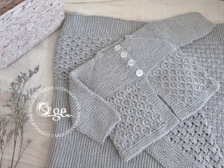 The jacket is worked in one piece from the top down, bodice and sleeves are worked in garter stitch with a simple all over pattern on the bottom section. No seaming involved.
