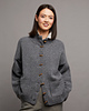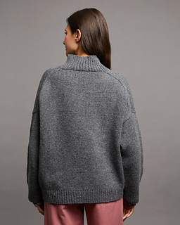 The oversized jacket with strongly dropped shoulders, stand-up collar, and double-knit button bands, is worked entirely double stranded and seamlessly top down and starts at the accentuated shoulder line in the upper back. First, the back is worked down to the armholes, then the two front parts are worked from this shoulder line in opposite direction, front and back are then joined together at the bottom of the armholes. The sleeves are knitted directly onto the jacket and are worked in the round, then the button bands are worked. Stitches for the pockets are picked up and knitted just above the bottom border, the pockets are worked back and forth and then sewn on the jacket.