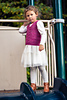 Vest is intended to fit with approximately 2” (5 cm) of positive ease at the chest. Pink sample shown in size 6 with lace panel on a 4-year-old; blue sample shown in size 6 (slightly tighter gauge) with non-lace panel on an almost 3-year-old.