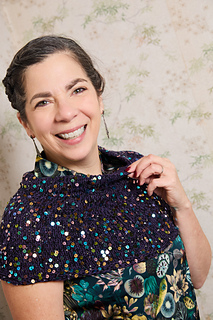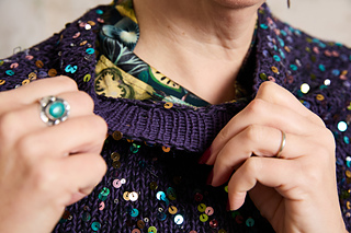 Blingola Shrug is knit with two fabulous yarns — Lola’s Blingola (a 100% cotton with multi-colored sequins) and Pascuali Puno, a scrumptious cotton/alpaca blend. The fabric these two yarns make together is perfection. They are knit together at a loose gauge, allowing the fabric to drape and the sequins to easily pop to the front of your work. Knitting with bling has never been so easy!