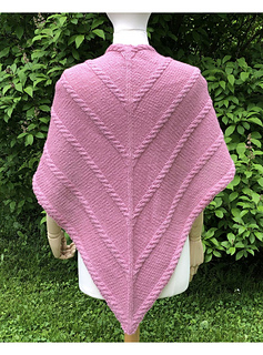 The shawl is worked from the bottom up in 2/2 cables and 12 sts of the reverse stockinette st between them. The shawl construction allows to knit the shawl of any size. After the central part of the shawl reaches the required size it has a square shape placed on point. Then the wings of the shawl are worked separately, one wing at a time.