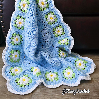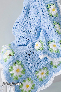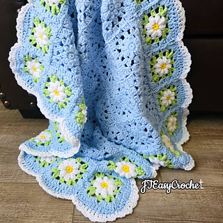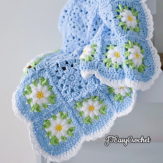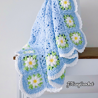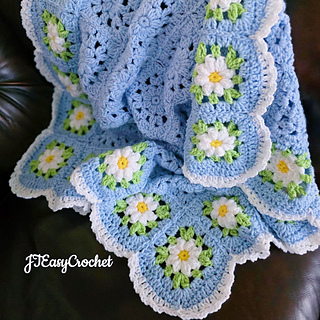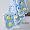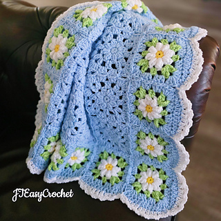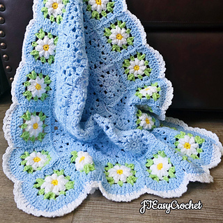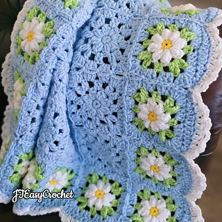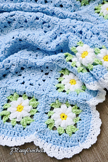 Easy Crochet Pattern & VIDEO, Blue Flower Granny Square Blanket With Daisy Border