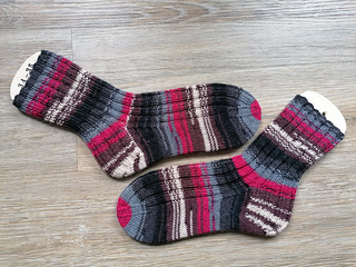 This is an extremely simple ribbed sock pattern intentionally written as a guide for those who are intimidated by the idea of knitting socks. It’s designed for those who can cast on and are comfortable with knitting and purling but maybe not much else. Thorough descriptions of what’s happening while the sock is being constructed, and links to free, ad-free videos are included along with way too much instruction for the experienced knitter.