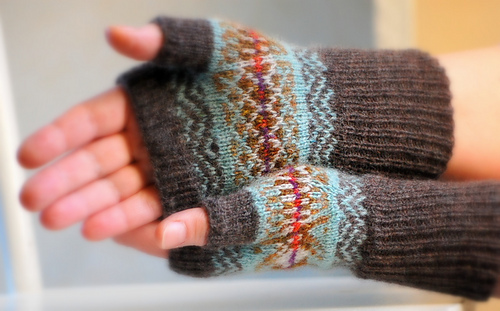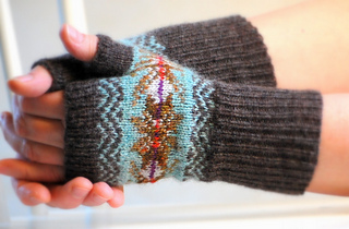 The mitts are knit in the round from bottom cuff upwards, using the stranded technique with only two colours in any one round.