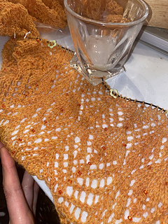 It’s so pretty (hard to convey in photos); the luxury of the yarn, the shine, the halo of the alpaca, and the glint of the beads. It is drapes nicely due to the fiber, and the weight of the beads also helps the drape. This would be beautiful for a wedding shawl in all white or cream. The lace at the bottom is deep and just gorgeous. Excellent for a gift!