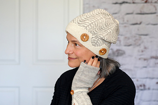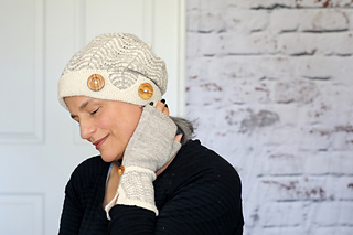 The very plainest wave uses an added slipped stitch to showcase beautiful natural yarns in the subtle shades of Castle Rock on Lake Tahoe. The pattern stitch itself is extremely simple, but the hat and mitts get a distinctive look from the colors chosen and the details used in the hat brim and the cuffs of the mitts. And buttons. Don’t forget the buttons.