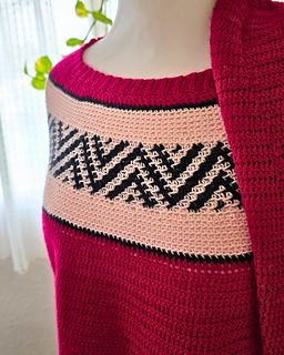 El Cholita Sweater es un jersey de ganchillo tejido de arriba hacia abajo (top-down), sin costuras, con un canesú circular decorado en tapestry crochet. Combina tradición y diseño contemporáneo en una prenda cálida, cómoda y muy favorecedora.