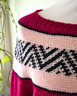 - Circular yoke, with short rows, decorative rounds, and tapestry crochet