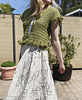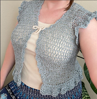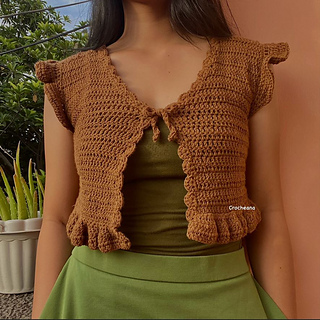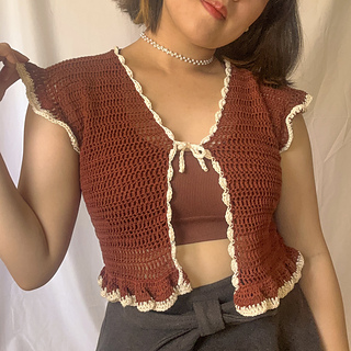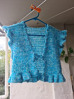 This piece has a light, flowy, and feminine feel that is perfect for summer and spring outfits. It is worked by creating back and front panels, joined together before adding sleeve, ruffles, and edging details.