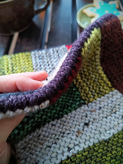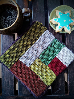 Each side of the trivet is constructed modularly, and seemed together. Two blocks are then sandwiched together to made a double thick and reversible trivet, that is then finished with Kitchener stitch around the perimeter.