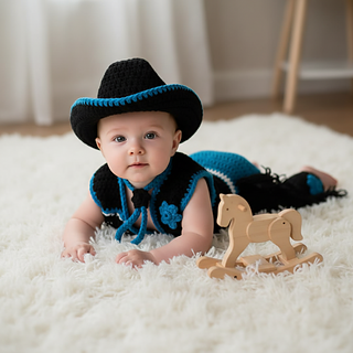 Welcome to the wild west. How cute will your little ones look in their new western wear. The pattern includes instructions, for both and girl styles. Also comes in 0-3 months and 3-6 months. Very easy to read and clear instructions. Great for those first prop pictures, or just any day that they may wanna be sheriff :) Set includes, Chaps, Hat, Diaper Cover, Necktie, and vest. :)