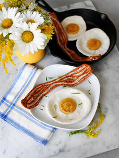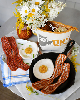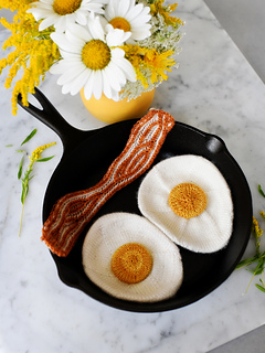 For the bacon, it walks you through everything from casting on, navigating brioche charts, getting the perfect shape to your strips, and even improvising your own versions in case you want to make something bigger and more dramatic. For the eggs, it covers everything from casting on, shaping your yolk, getting the perfect shape to your whites, and blocking your finished egg as well as giving detailed information on how to scale this up to make something like a pillow or even a blanket.