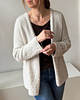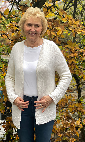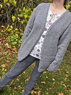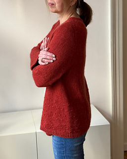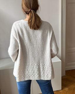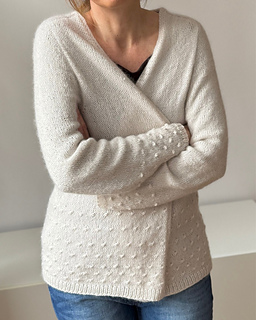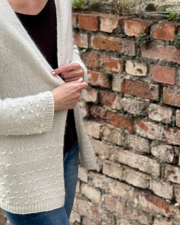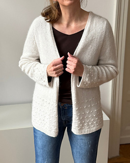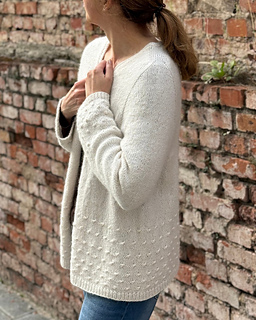 Dotta Cardigan is an open front, V-neck cardigan with long, wide sleeves. It’s worked in Stockinette stitch and features a popcorn pattern at the lower body and sleeves, which forms decorative little dots. The cardigan is worked top down in one piece. Beginning with the right and left neckbands, stitches are then picked up along the neckband edge for the fronts, the narrow saddle shoulders, and the back. The shoulder section is then worked with increases. The back neck is shaped with short rows. After reaching the cross-back width, the sleeve caps are created, and the upper body is worked in one piece to the length of the armhole depth, increasing at the sleeves, and later, at the body. The shoulders and sleeve caps are based on the contiguous set-in sleeve method, created by Susie Myers, but worked with some deviations. Once the upper body is finished, the sleeve stitches are put on hold and the lower body is worked down to the hem. The pattern contains instructions for both a straight lower body and a slight A-Line shaping. The front bands are worked lengthwise, simultaneously with the body. Finally, the sleeves are worked in the round.