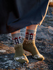 Worked from the top down, the socks begin with a classic ribbed cuff before moving into a landscape of stranded colourwork on the leg. Meadow flowers dance beneath the silhouette of the Moominhouse, while on the foot a curious Moomintroll peeks from the blooms, adding a touch of mischief and delight. The socks feature a ribbed heel, heel flap and gusset.