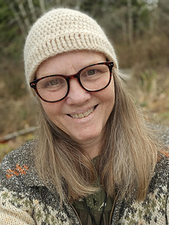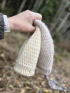 But, you can work yours up in a natural fiber, of course, if that’s what you prefer (see the image where I’m wearing a hat, and the one where I’m holding two hats side by side for comparison: one is Bernat acrylic, the other is Drops Air, a natural fiber). Just as long as your yarn meets the gauge, you’re good to go.