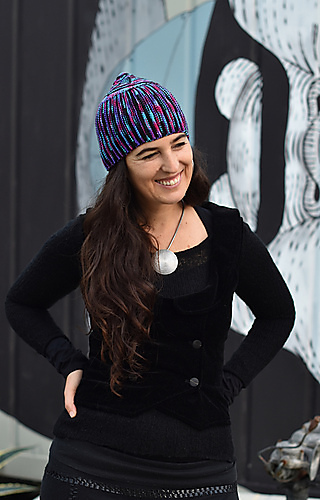 After meeting Elbert at a discussion panel in Rimini, Italy, and after seeing his yarns in person for the first time, I wanted to face the challenge this colourway presented and design a Hat that didn’t pool and was able to show the vibrant colourway to its best. Turning one part of the Hat sideways by knitting it flat solved this problem, and knitting the remainder of the Hat in the round in a vertical direction worked perfectly with the yarn, creating a striking effect.
