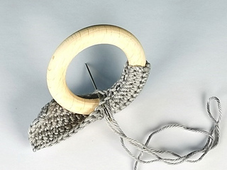 - Houten ring met een doorsnede van 5,5 cm. U kunt ook andere maten gebruiken. Er is een omschrijving hoe u het lapje voor de ring moet haken en bevestigen.
