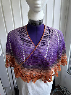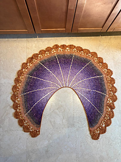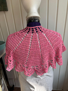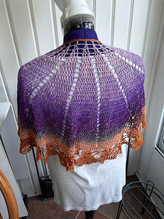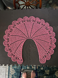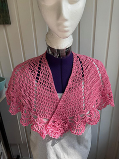 I named this shawl Erma Gean to honor my mother who passed away suddenly in August 2025. She would have loved it. This shawl is more than a half circle that wraps around your shoulders and body. Worked from the top down, it finishes with a fan lace border. Samples were made with fingering/sock weight yarn/#1 (430 yards for a smaller size and 640 yards for a larger shawl) and a size G/4mm crochet hook. The smaller shawl measured 32” neckline x 12.5” long before blocking to 35” neckline x 15” long and the larger shawl measured 33” neckline x 13” long before blocking to 43” neckline x 18” long. It can be made any size with any weight of yarn with a hook size that works for that yarn. Save about 50% of your yarn back for the border or use another yarn for the border.
