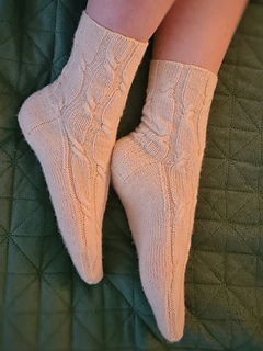 I like my coffee blonde and sweet with extra whipped topping. The gentle cables of these socks are spaced generously, to allow for some down time to chat while knitting, but still evoke the twisty whipped-cream topping of your favorite espresso drink. These socks are the perfect fall and winter accessory, giving a playful feel to cold-weather dressing.