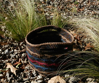 The gauge is 7 rows of single crochet in the round at 4”. The pattern calls to the reader to check the gauge when reaching row 7. The gauge is not critical, and a tighter stitch results in a sturdier, but slightly smaller, basket. The actual measurement may range between 3.5” and 4.25”.