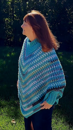 Here is a poncho design that uses a blend of two complimentary fibers utilizing the beautiful feather stitch. Worked from the top down, you will have the option of making it with the shorter “mock” turtleneck or longer as a turtleneck you can fold down. The pattern includes detailed written instructions, is easily customizable and incudes helpful photos.