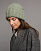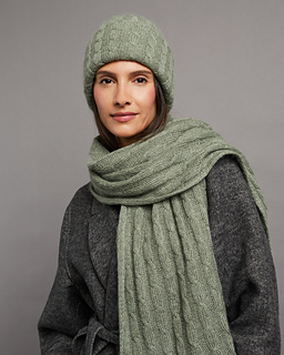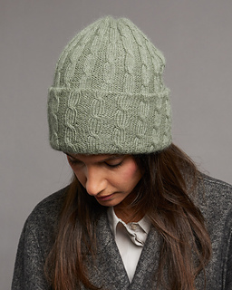 The double-layered hat with a simple cable pattern is started at one tip and is worked continuously in the round. Increases are used to achieve the final width, then the hat is worked to a length of approx. 68 cm/26.8” without further increases. Decreases from the second tip of the hat. One half of the hat is pulled inwards, creating the double-layered hat and the wide lower edge is then turned up.