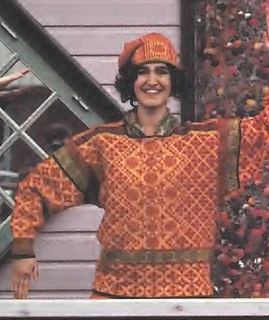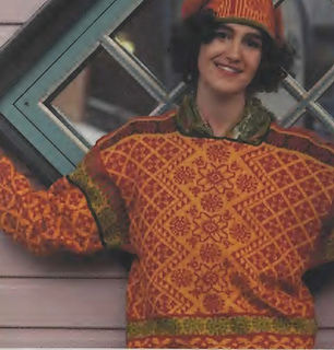 "Here three main colors are varied by using them in different ways. Green is used in three tones. Yellow and red have different emphases in each area of pattern; the band at the bottom of the body balances red and yellow equally, while the back is primarily red and the center front is mainly yellow. So these two colors give three completely different effects depending on how much of each color is visible. The cap, halfway between an ordinary ski cap and an alpine beret, is becoming to almost any head."