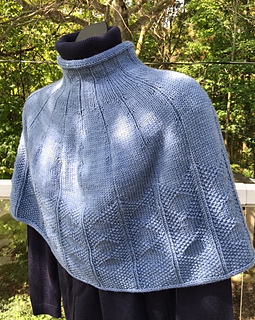 The cape is cast on provisionally and worked in a knit 5, purl 1 rib that widens to a knit 15, purl 1 rib past the shoulder. A knit and purl stitch pattern creates the Gansey-inspired diamond shapes of the body. I-cord cast-off finishes both the hem and the neckline.