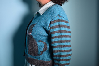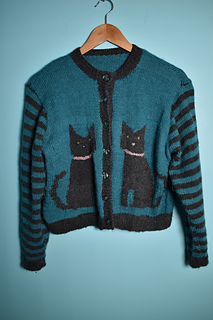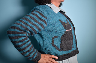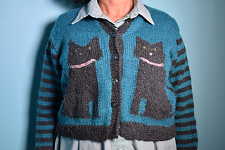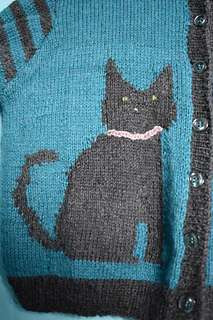 This pattern is designed for an intermediate knitter. It uses a colour blocking technique called Intarsia. You will be working from multiple small balls of wool at the same time to build the cat figures into the fabric. You will also be reading the pattern from a chart so will need to be confident interpreting charts. The eyes, nose and collar can be knitted in intarsia or if preferred, embroidered by hand after the cardigan is completed.