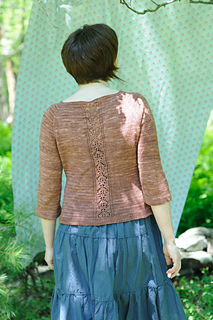 A reversible sweater with three-quarter sleeves that may be worn as a cardigan with the lace detail in the back and buttons in the front, or as a pullover with the lace detail in the front and buttoned up the back. Gemini is worked from the top down, in one piece, with raglan shaping and worked in button bands.