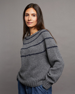 • BERGAMO 325 (350/400/450/500/550) g in Slate Grey 28M and 25 g (same for all sizes) in Navy 11, 1 stitch marker, 1 tapestry needle