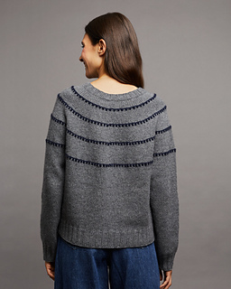 The pullover with horizontal stripes, worked in a contrast color in textured pattern in yoke, is worked seamlessly top down and starts at the neckline border. The plunging front neckline is formed by using short rows. Subsequently, work is continued exclusively in the round, with textured pattern-stripes in yoke and in plain St st in rest of body and sleeves.