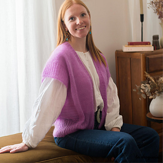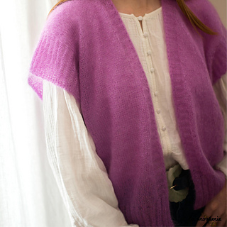 Gilet tricoté en Plumette (70% mohair super fin, 30% polyamide) ou Brume de couleur (82% baby alpaga super fin et 18% polyamide) en double. Ce modèle se porte ample, ouvert sur le devant, sans boutonnage.