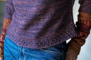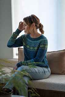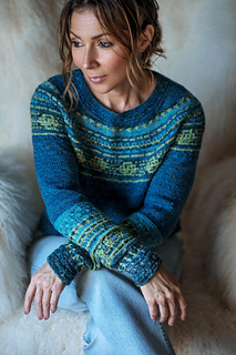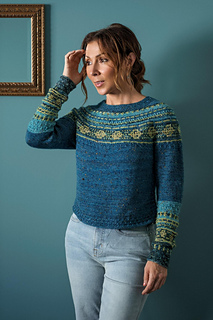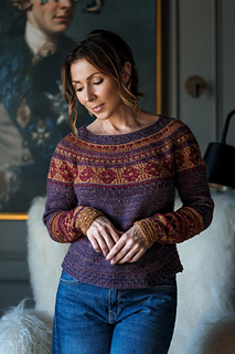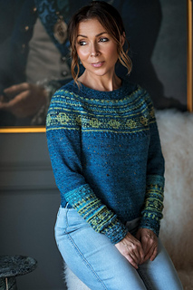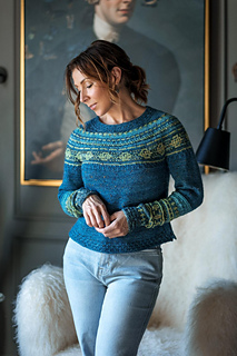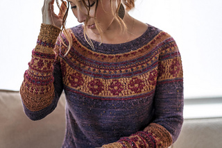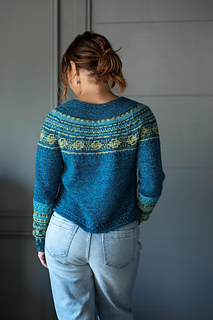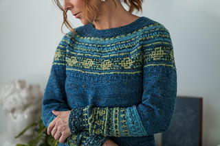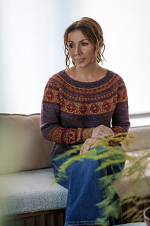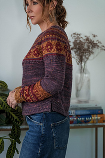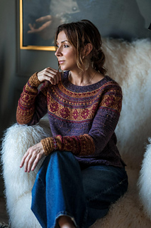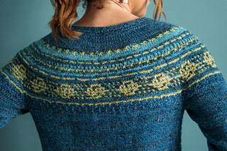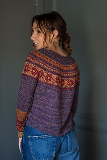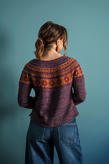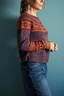 The slip stitch patterns in this sweater provide for a lot of texture, with minimal effort. The knitter needs only to work one color at a time to achieve the intricate looking yoke and sleeve detailing. Utilizing the slip stitch pattern along the sides creates a slight curve to the hem. Designed to fall just below the high hip, this sweater may easily be altered to any length.