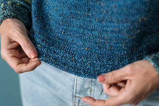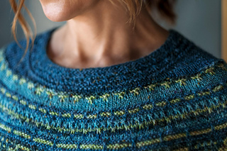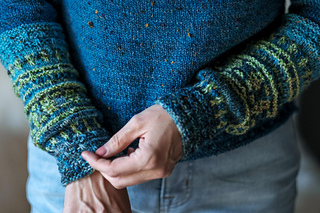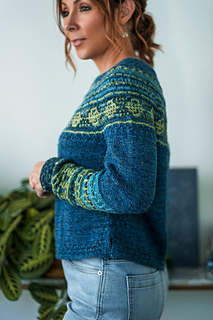 The construction is top down, beginning with an integrated neckband. German Short Rows are used to shape the neckline, followed by the mosaic yoke. Here, the knitter should check that they have a good fit, and then divide the stitches to complete the remainder of the body. Returning to the on-hold stitches, each sleeve is completed individually.