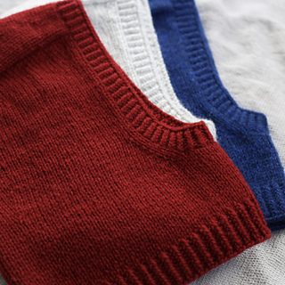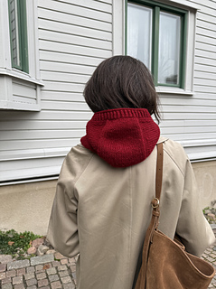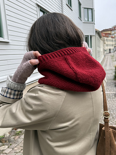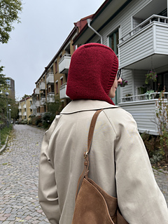 The red Haga Hood is worked with Rauma Garn, Vams (col. 35).