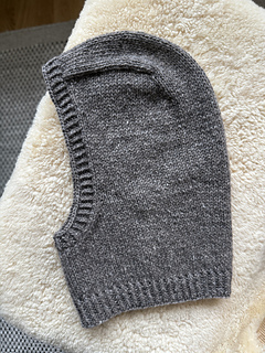 The upper piece is worked flat. Stitches are then picked up along the sides and the hood is worked back and forth, with increases and decreases. After the shaping is completed, the hood is worked in the round.