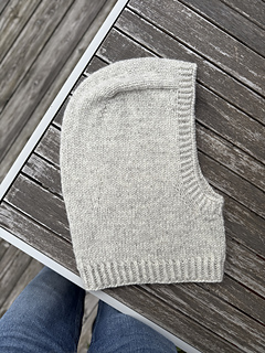 The grey Haga Hood is worked with Rauma Garn, Vams (col. 03).