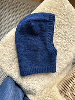 The blue Haga Hood is worked with De Rerum Natura, Gilliatt (col. Nuit) held together with De Rerum Natura, Bérénice (col. Delphinium).