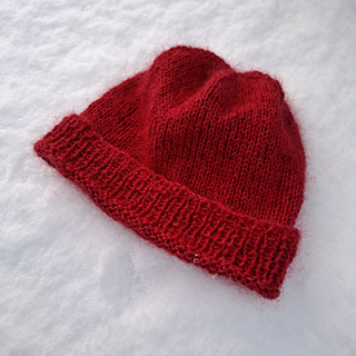 The hat is knitted from the bottom up, and with two yarns held together. The rib is folded up when the hat is finished.