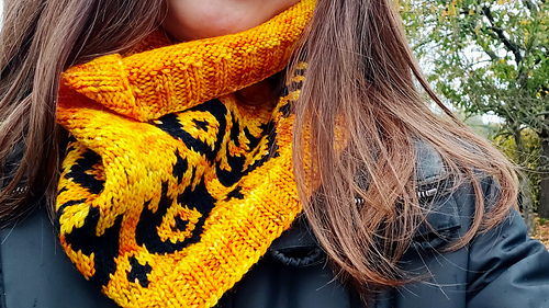 The cowl is worked from the bottom up and in the round. Basic instructions are written but the main colourwork motif is charted only.