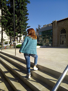 Die Jacke wird nahtlos von oben nach unten gestrickt; das Rippen- und Lochmuster ist einfach zu merken und bringt Abwechslung in lange Reihen.