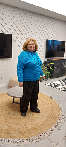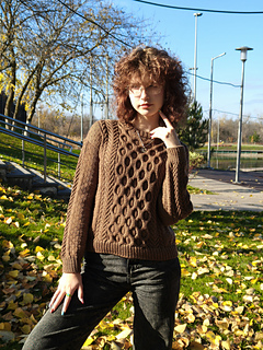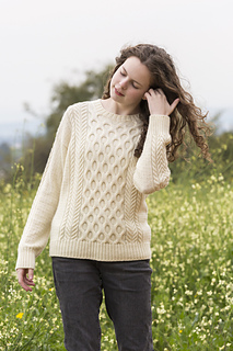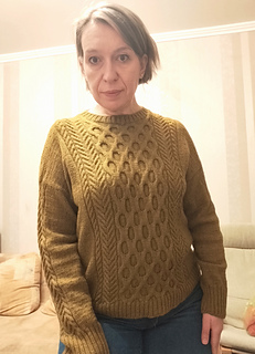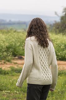 Firstly, the back and front parts of the yoke are worked separately until underarms, then they are joined in the round and knit as one piece. The sleeves and neckband are worked in round too; no seaming is required.