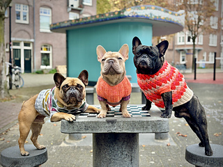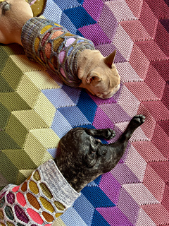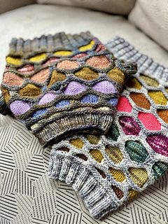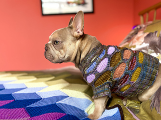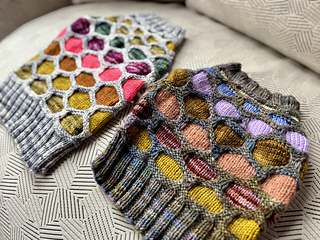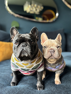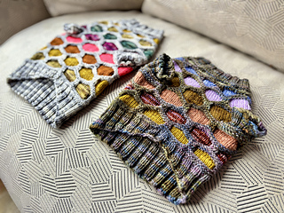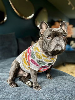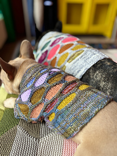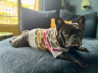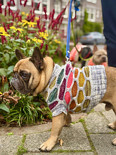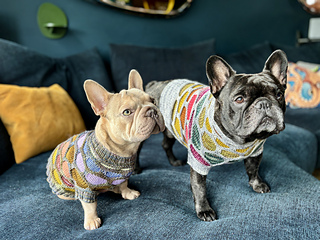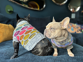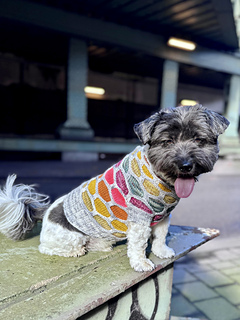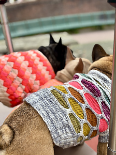 Combine one main color with lots of contrast color pops to knit this DK weight dog sweater. The sweater is knitted in the round starting with the ribbed collar and working toward the body. Slipped stitches form the honeycomb motif and you only work with one color at a time. The instructions include notes to help customize the length of the yoke and body to fit your dog. Go bold with bright color pops and use as many colors as you like!