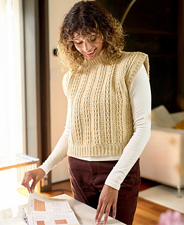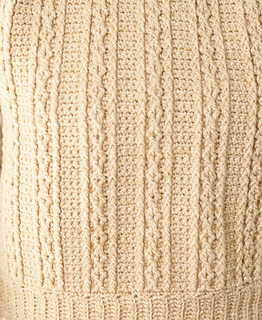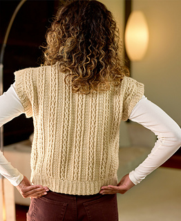 This Vest is worked from the bottom up in pieces and seamed. Ribbing is crocheted separately and sewn onto Sleeve and Neck openings.