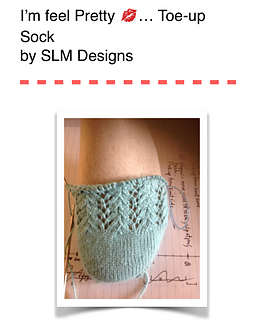 Perfect sock for travel knitting. Sock features include toeup construction, short-row heel with mini gusset and mini flap, lacework foot and leg, and tiny picot bind off.